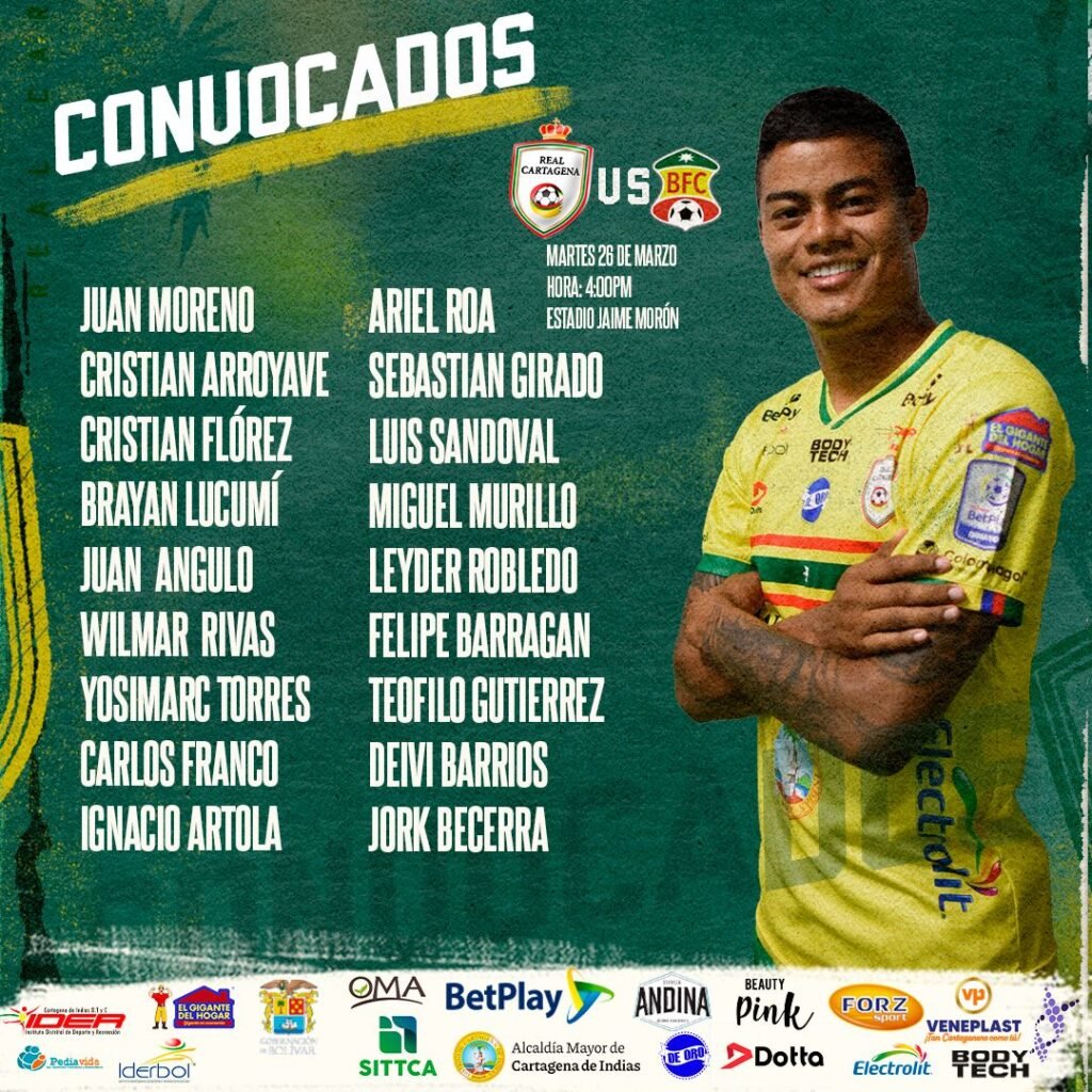 El profesor José Alberto Suárez entregó la lista de 18 jugadores convocados para el importante partido de mañana martes 26 de marzo, cuando Real Cartagena enfrente en el estadio Jaime Moron al Barranquilla, al cual hace rato no le gana en el torneo de la Primera B.