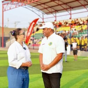 La alta funcionaria intervino en la noche de este viernes en los actos inaugurales del remodelado estadio de San Fernando, al igual que el director general del IDER, Campo Elías Theran Humanez, el presidente de la liga de fútbol de Bolívar, Carlos Mario Cortes, la Alcaldesa de la Localidad 3, Lucelly Garrido, y el futbolista profesional, Christian Marrugo.