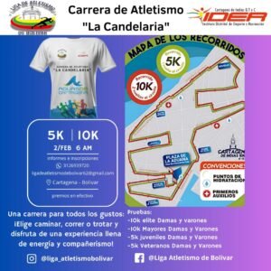 La Carrera Atlética “La Candelaria”, día 2 de febrero de 2025, cuenta con el patrocinio de IDER, Aguas de Cartagena, Hidratao, Supergiros, Izaniela Fisioterapia. Organiza: Liga de Atletismo de Bolívar.